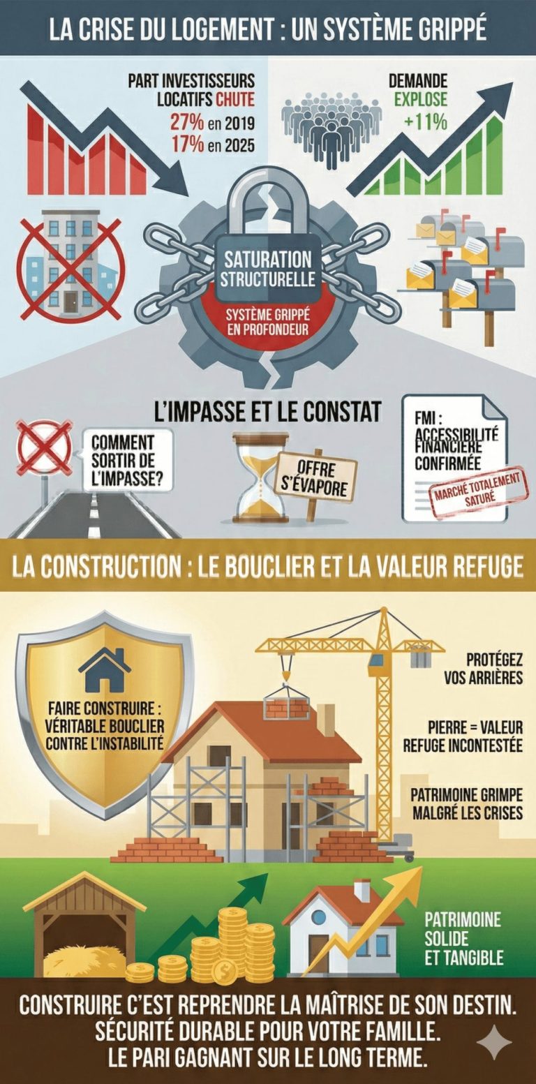 L’essentiel à retenir : alors que la pénurie de logements s’installe durablement, exacerbée par les contraintes énergétiques, la construction neuve devient la réponse pragmatique. Ce choix permet de contourner les coûts de l’ancien pour bâtir un patrimoine stable et performant. Dans un contexte où la demande grimpe de 11 %, la pierre confirme son statut de valeur refuge absolue.